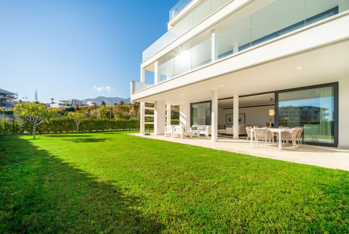 Stunning west facing corner garden apartment, with 3 bedrooms, and 2 bathrooms, spacious living-dining room, open plan kitchen fully furnished and equipped with electricial appliances from Bosch, including MIELE fridge/freezer, laundry area with washing machine/dryer, large wrap around terrace of 78m2 with access from living area and main bedroom. There is also a backside terrace of 34m2 with access from the secondary bedrooms. Spacious private garden area of 258m2. Main bedroom with ensuite bathroom and walk-in wardrobe. Air conditioning hot and cold, built-in wardrobes in secondary bedrooms and hall entrance, video intercom, domotic system, pre-installation alarm system, water purification system in kitchen, under floor heating throughout all the apartment including bathrooms. Includes two parking spaces (one parking with electric car charger) and one storage room.
