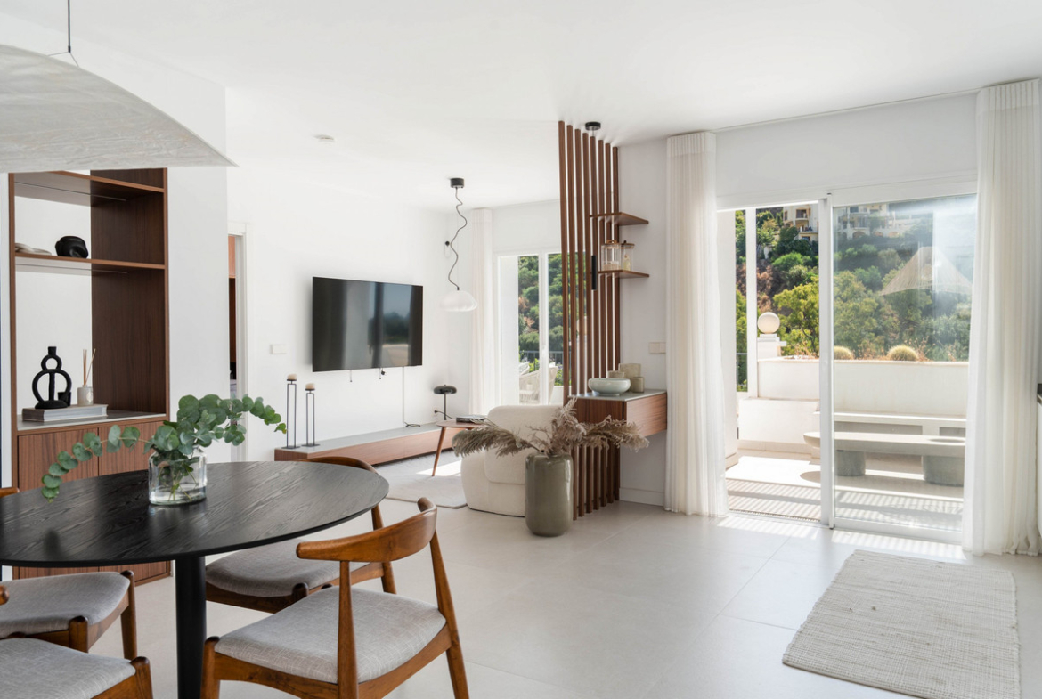 The interior includes two serene bedrooms and three stylish bathrooms, while the expansive terrace—facing south and east—provides breathtaking views of lush landscapes and the Sierra de las Nieves mountains. Ideal for relaxing or entertaining, the terrace seamlessly extends the living space outdoors.