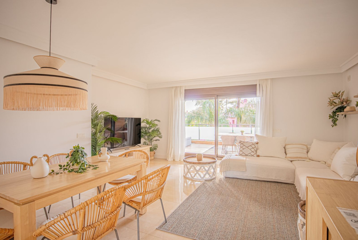 Renovated apartments with 3 bedrooms, living room, kitchen, two terraces, with all amenities in Las Salinas. The apartments are located 200 meters from the beach, 8 km from Estepona, 18 km from Marbella and 34 km from Ronda. It offers 2 shared outdoor pools, 1 indoor pool, sauna, gym and free Wi-Fi. The master bedroom has a private bathroom, King-size bed, large TV, large closet and private access to the terrace. The second bedroom has two separate beds , bedside table, closet, large TV and access to a small terrace. The third bedroom has two separate beds, bedside table, closet, large TV and access to a small terrace. The second bathroom with shower and toilet has a separate entrance from the shared hallway. The kitchen is equipped with a built-in dishwasher, refrigerator, hob, oven, microwave, extractor hood, kettle, toaster and coffee maker. The living room has a large flat screen TV, a large dining table for 6 people, a large corner sofa and access to a large sun terrace. There is also a laundry room with washer and dryer, ironing board and iron.The apartment has dedicated parking space in the undergounf parking and a storage room. Apartment will be sold fully furnished.