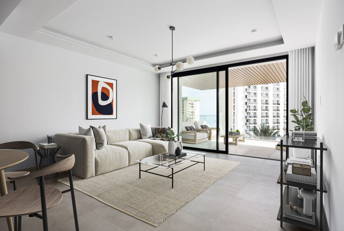 Introducing an unparalleled opportunity to own a brand new, never-before-lived-in apartment a few meters from the beach. This luxurious residence boasts a spacious open floor plan, adorned with high-quality materials and fresh, bright colors that create a vibrant and welcoming atmosphere. The east-facing apartment is bathed in natural light, thanks to the expansive windows and sliding doors that seamlessly connect to a wrap-around terrace, offering stunning sea and mountain views and an ideal space for relaxation and entertainment.
