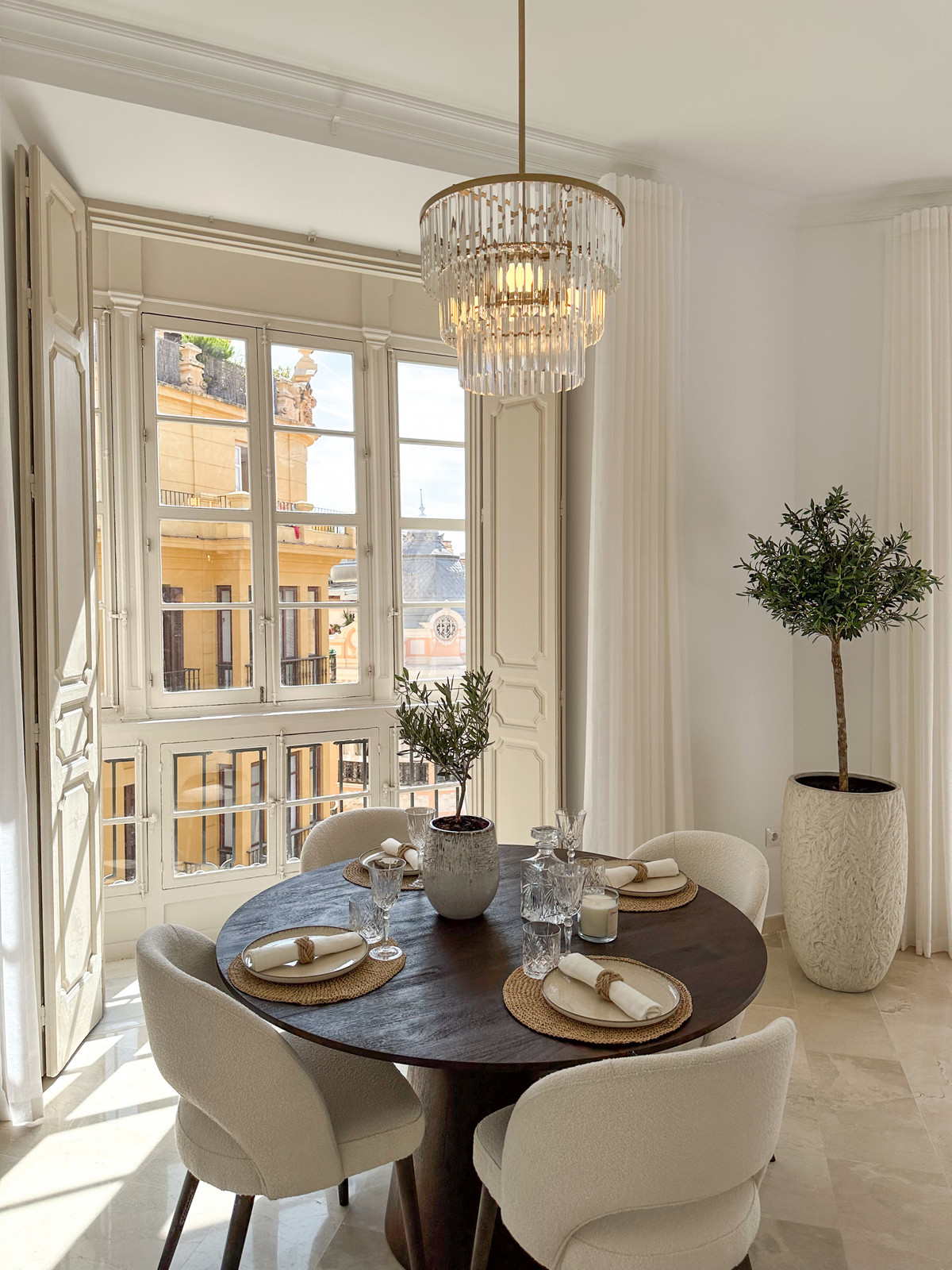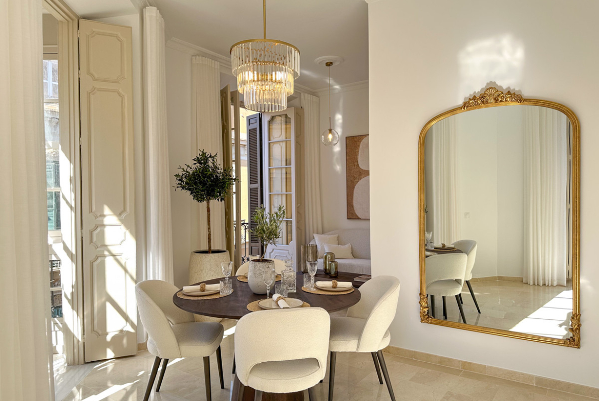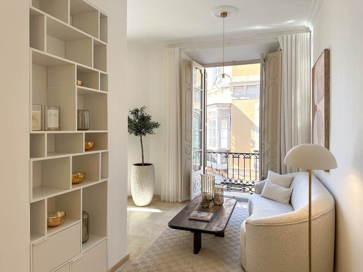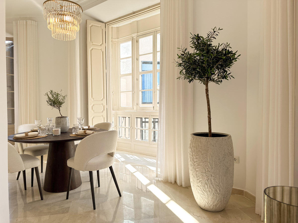 Beautifully presented apartment situated on the third floor of an outstanding building designed by the renowned architect Geronimo Cuervo, famed for the iconic Teatro Cervantes. Facing southeast, the property enjoys an abundance of natural light. Its meticulous design, featuring soaring ceilings and 5 French balconies, exudes both elegance and luxury. Recently renovated with the best qualities, the dwelling comprises a spacious living room, dining area, open plan fully-equipped kitchen with island, 2 ample bedrooms, a smaller bedroom/office room and a complete bathroom.