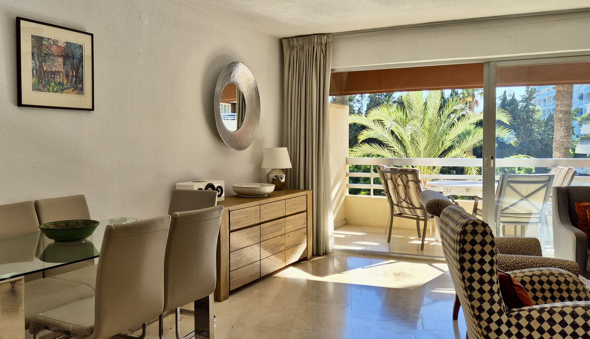 The bright living room offers an excellent space to enjoy both dining and relaxation by the TV. You can also step outside to a wonderful south-facing terrace that overlooks the pool, where you can enjoy al-fresco dining or evening drinks, whilst knowing that you have everything Marbella has to offer right at your doorstep. The kitchen is ample in size, and as a bonus, a gas stove connected via natural gas, which is perfect for those who enjoy cooking.
