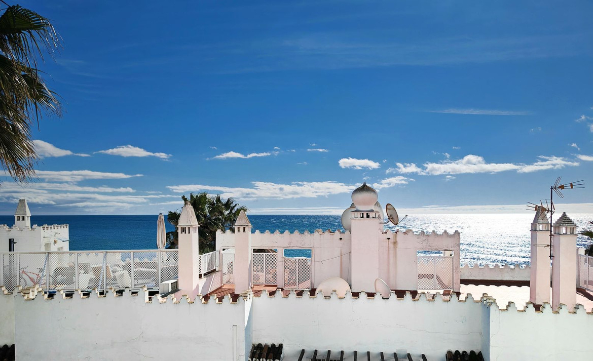 Corner penthouse for sale in one of the best beachfront developments in Mijas Costa, Calahonda. The apartment is on the first floor (no lift) and has 2 exterior bedrooms and 2 full bathrooms (with the possibility of easily converting it into 3 bedrooms), with a large corner and private terrace. From the apartment there is an impressive sea view, from the kitchen, living room, bedroom and terrace. The apartment is sunny all day, especially in winter when the sun is lower. There is new air conditioning (split, hot and cold) in the living room and in the master bedroom. The kitchen is large, exterior with a window and fully equipped, with a serving hatch that opens onto the dining area. The dining room and living room are spacious and sunny. There are built-in wardrobes in both bedrooms. There is a private parking space included in the price. It is a gated community with communal gardens and a large swimming pool facing the sea. You can exit through the community directly to the beach and can walk easily to several restaurants, beach bars, supermarket, pharmacy etc. We have refurbished several apartments of a similar size in the same urbanization for our investors from 2 bedroom to 3 bedroom apartments and we can show you before and after of those units, and you can visit them personally to get an idea of what can be done.