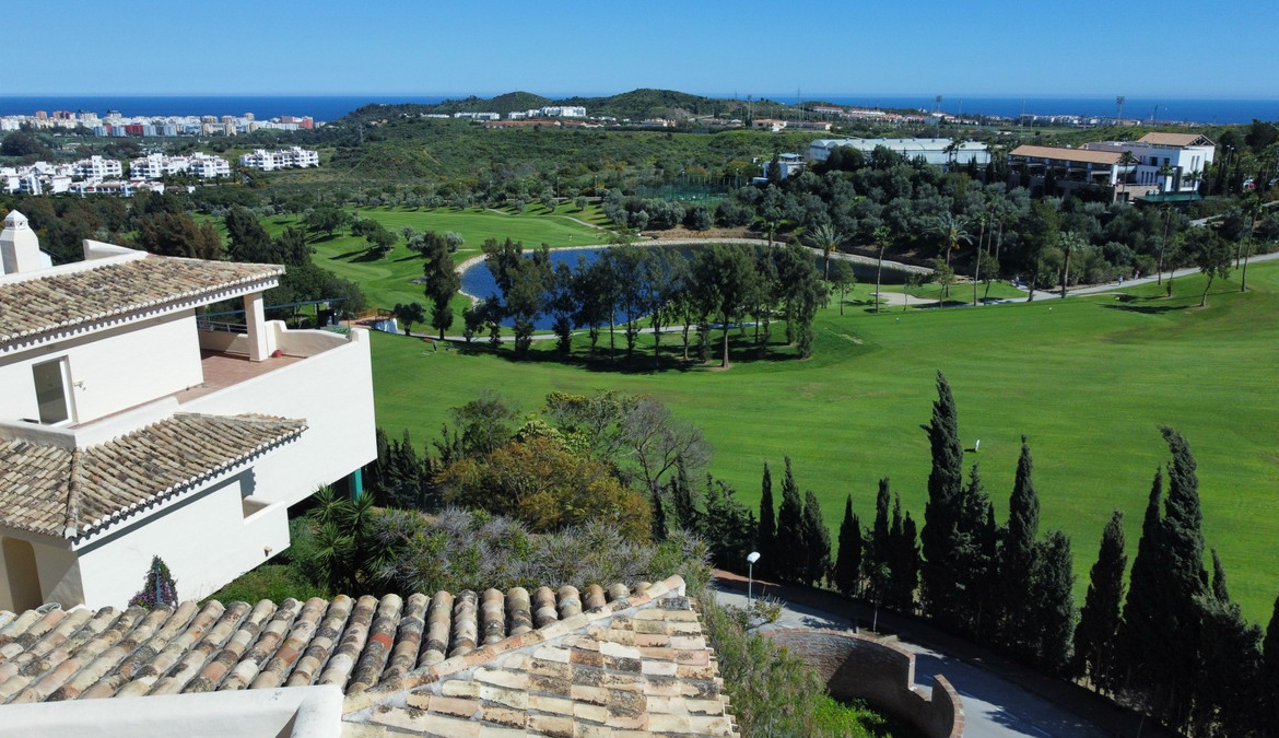 This contemporary penthouse in Mijas, Málaga, offers a harmonious blend of comfort and style. It is located directly on a golf course and offers an impressive view of the sea, so you can enjoy both the tranquillity of the green and the panorama of the coast. The open-plan living area features floor-to-ceiling windows that flood the space with natural light and provide stunning panoramic views of the surrounding landscape. The living room is tastefully furnished with a plush white sectional sofa, accented by vibrant area rugs that add warmth to the polished floors. The sleek kitchen boasts modern navy cabinetry contrasted with white countertops and high-end stainless steel appliances, creating a sophisticated culinary space. The penthouse's three bathrooms are elegantly appointed, with one showcasing a floating double vanity in rich wood tones and a glass-enclosed shower. The primary bedroom is a serene retreat with direct access to a private terrace. It features a canopied bed, a spacious walk-in closet, and a luxurious en-suite bathroom with both a bathtub and a shower. The second bedroom offers equally impressive views and is furnished with a comfortable double bed. A dedicated office space provides a functional work area with a modern desk setup and ample natural light. The crowning feature of this property is the private terrace, complete with a swimming pool and expansive views of the surrounding hills and greenery. Additionally, the penthouse includes two parking spaces and two storage rooms. Residents also have access to excellent communal amenities, including a large swimming pool, a heated pool, and an outdoor kitchen that can be used by everyone. With its thoughtful layout, luxurious amenities, and prime location in Urbanización Cerrado del Águila, this penthouse offers a perfect balance of indoor comfort and outdoor living in the heart of Costa del Sol. We are pleased to be able to present this dream property to you soon, either personally or via virtual viewing. Because this world is unique – just like our Axarquía. In Andalusia. On the Costa del Sol. Here, on the sunny side of life…
