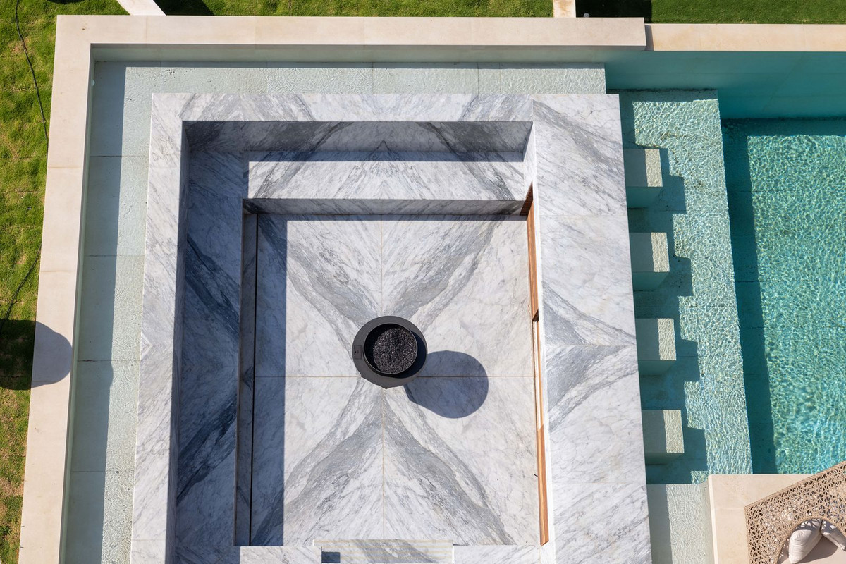 The exterior of this level is a true oasis of peace, with a swimming pool, a Carrara marble-clad spa with matching seating, and an open-air fireplace, terrace areas, a spectacular barbecue, and a beautifully landscaped garden.