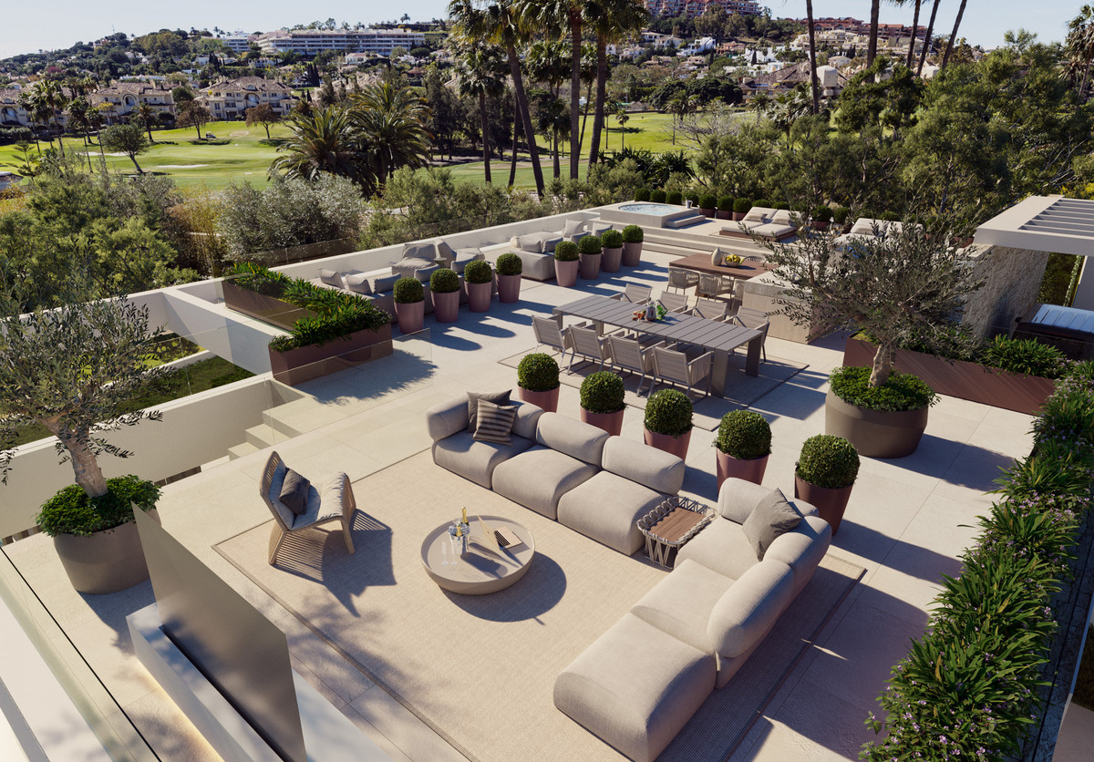 Elevate your entertainment aspirations on the rooftop terrace – a dream come true for those who love to host. Here, you'll discover an outdoor kitchen, spacious seating and dining areas, an open-air cinema, and a luxurious DROP spa. From this vantage point, you'll relish unparalleled views of the golf course and the picturesque valley, creating an atmosphere of pure sophistication.