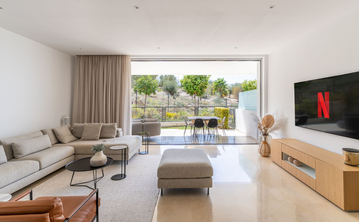 The master suite is located on the first floor and includes built-in wardrobes, an en-suite bathroom and its private terrace. Further there are 2 guest bedrooms with built in wardrobes, which overlook the gardens, and 1 bathroom. All bathrooms have custom made cabinets under the sink.